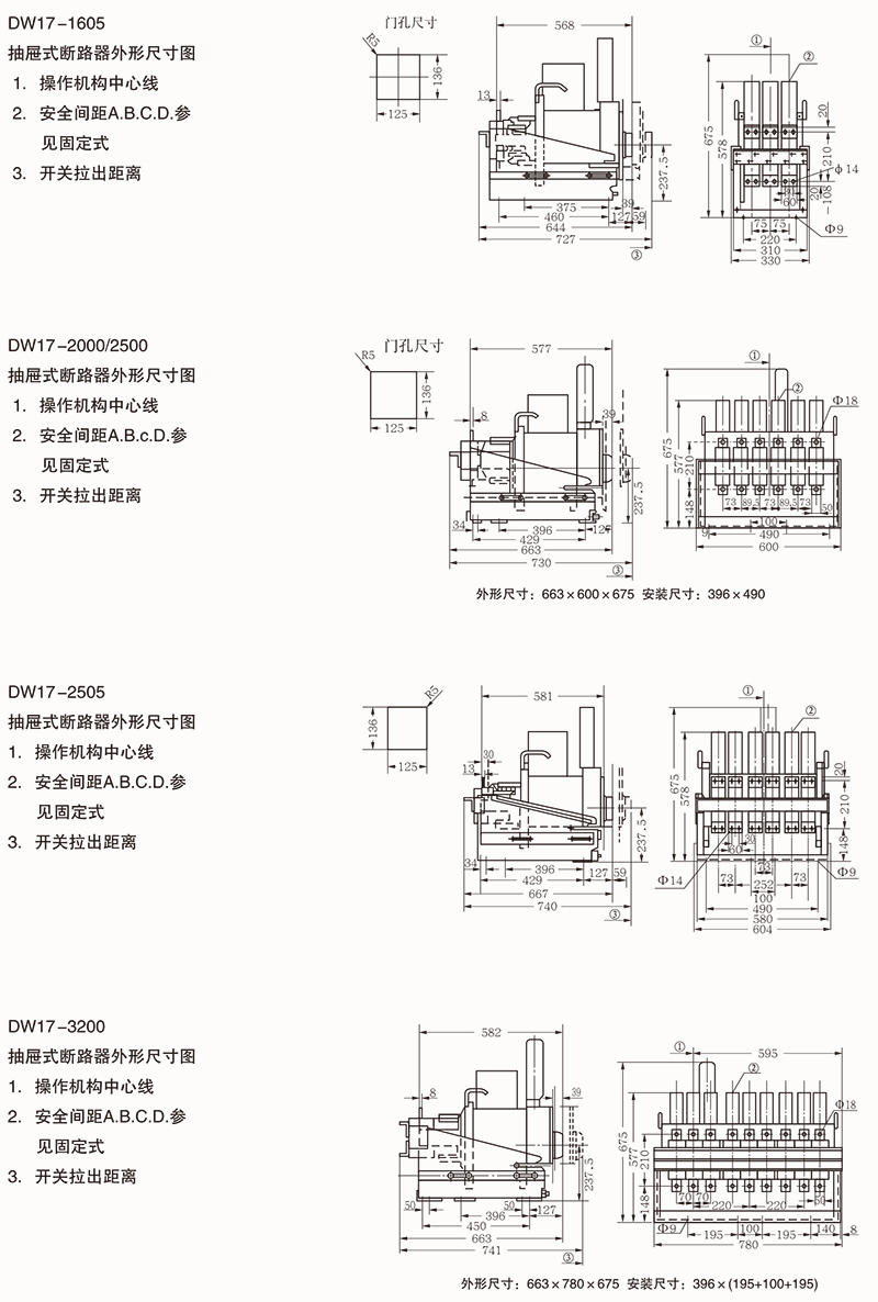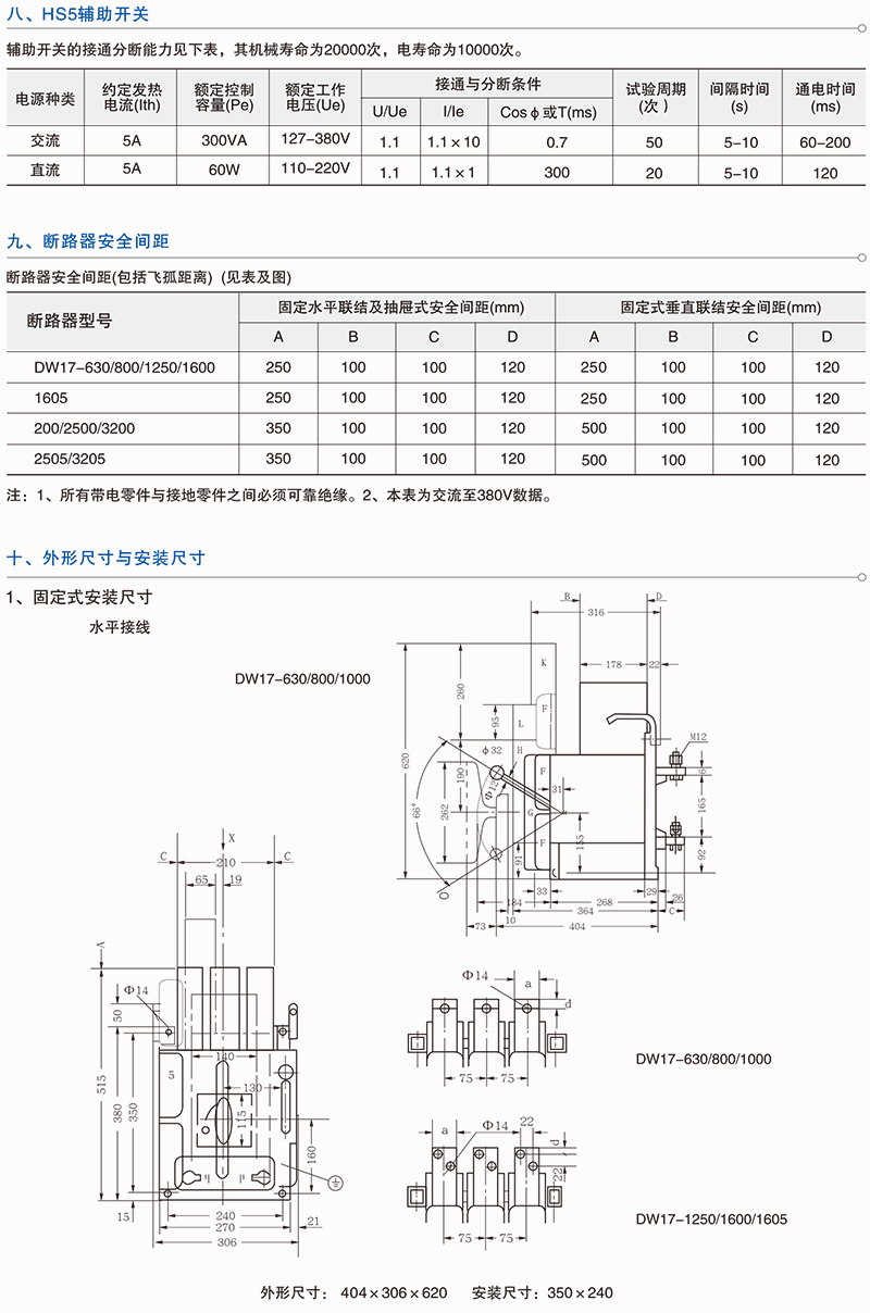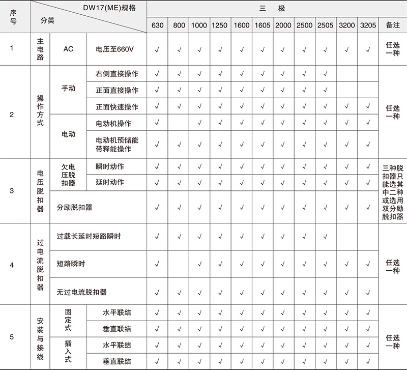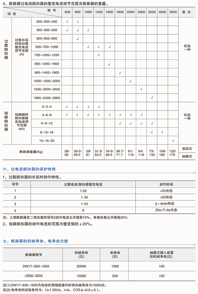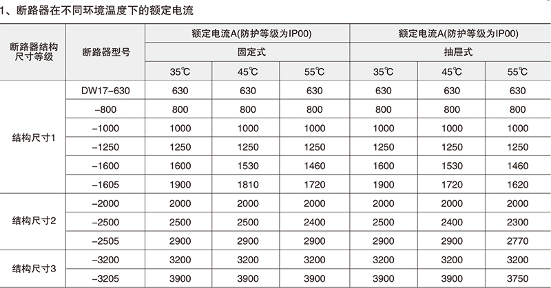 当断路器DW17-630/800/1000/1250型选用无过电流脱扣器时额定电流可分别提高到760/910/1200/1300A。
