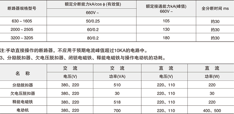 本系列断路器通断能力按IEC60947- 2国际标准及VDE0660规范的P- 2, 0 3min CO 3min CO要求,当电源为.上进线或下进线及短路短延时保护(延时为≤300ms)时,通断能力指标均相同,具体指标见下表。