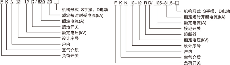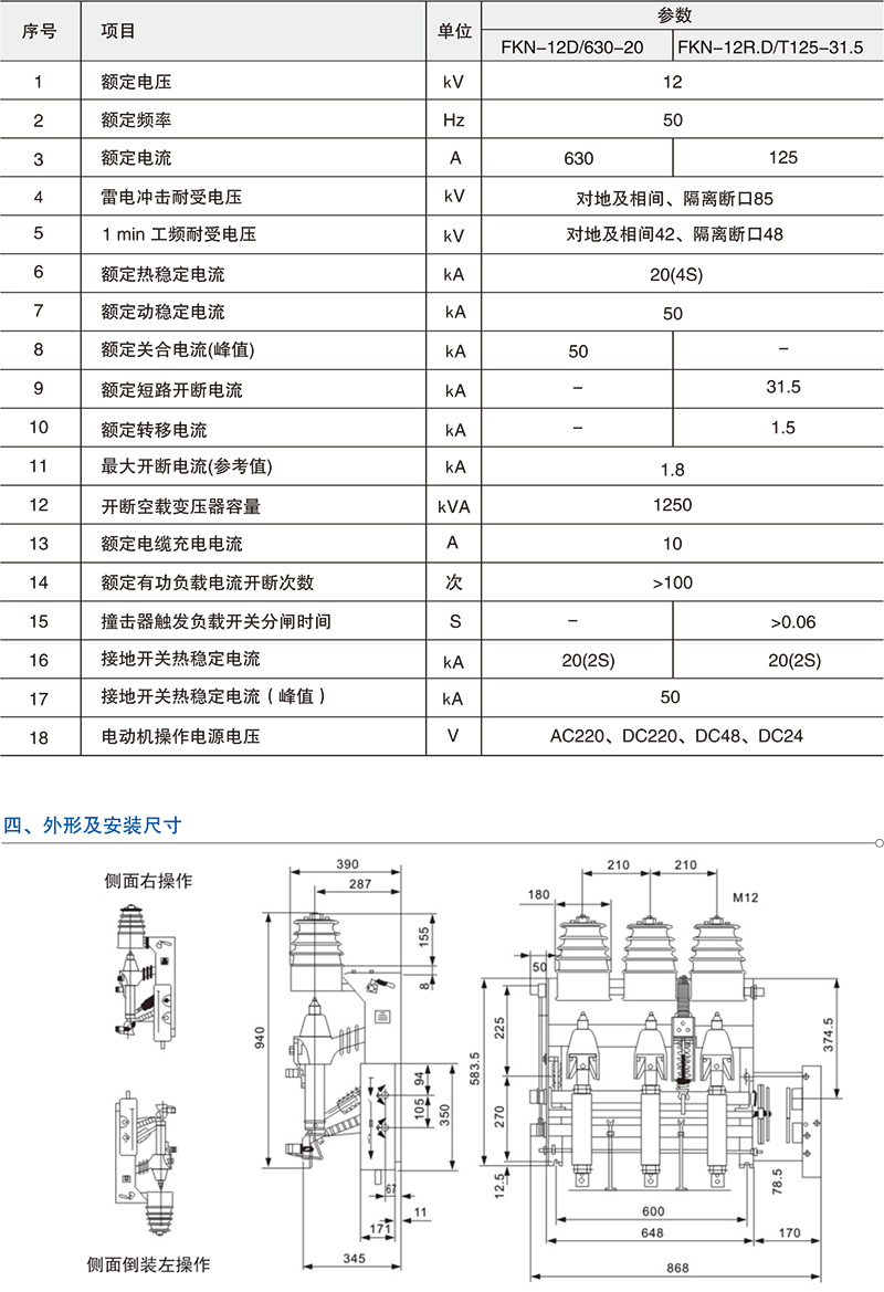 概述 FKN - 12D/630- 20型户内交流高压负荷开关(以下简称FKN- 12D负荷开关)是额定电压为12KV,额定 频率为50HZ的三相高压开关设备,用于分合负荷电流,闭环电流,空载变压器和电缆充电电流,关合短路电流。 配装接地开关的负荷开关,可以承受短路电流。 FKN - 12R.D/125 - 31.5型户内交流高压负荷开关一一 熔断器组合电器 (以下简称FKN- 12R.D组合器)是 FKN - 12D负荷开关开断与SOLAJ -12(XRNTO- 12 )高压限流式熔断器组合在一起的户内高压开关设备。它可以可靠开断直至短路电流的任何电流:负荷开关开断工作电流,熔断器开断短路电流,联合开断工作电流与全短 路电流之间的任何过电流,同时熔断器通过其撞击器使负荷开关分闸。 二、使用环境条件 周围空气温度:.上限+40C,下限-25C; 海拔高度: 1000m及以下; 相对湿度:月平均值不大于90%, 日平均值不大于95% ; 周围空气应不受腐浊或可燃性气体及水蒸汽体等明显污染; 无经常性的剧烈运动, 耐污秽等级: 1级。 如使用条件超过上述规定,由用户与制造厂协商确定。