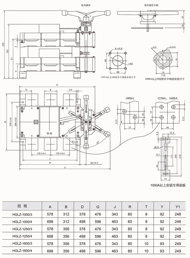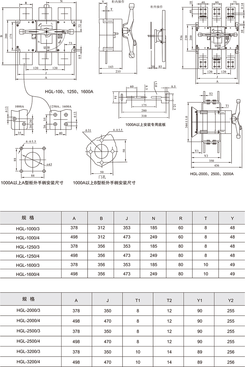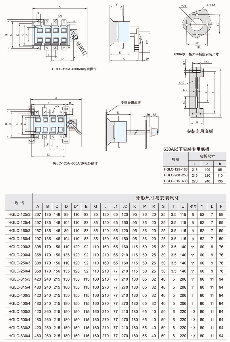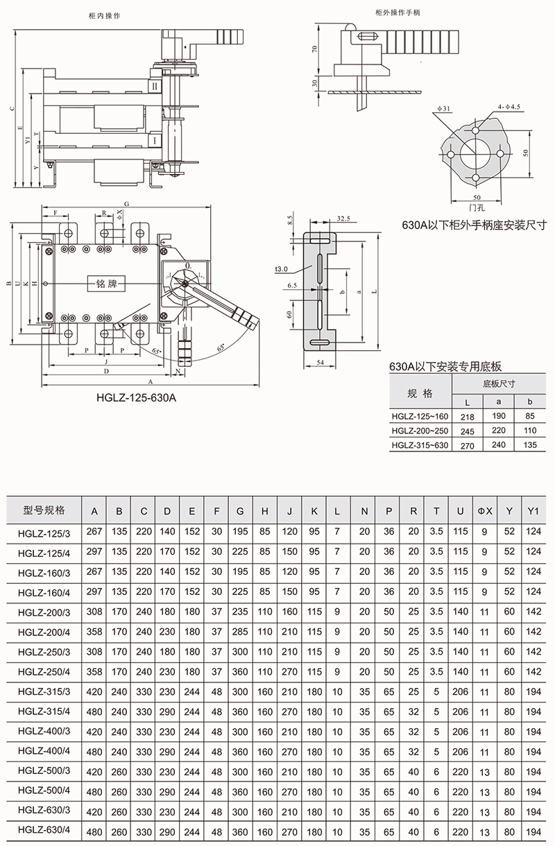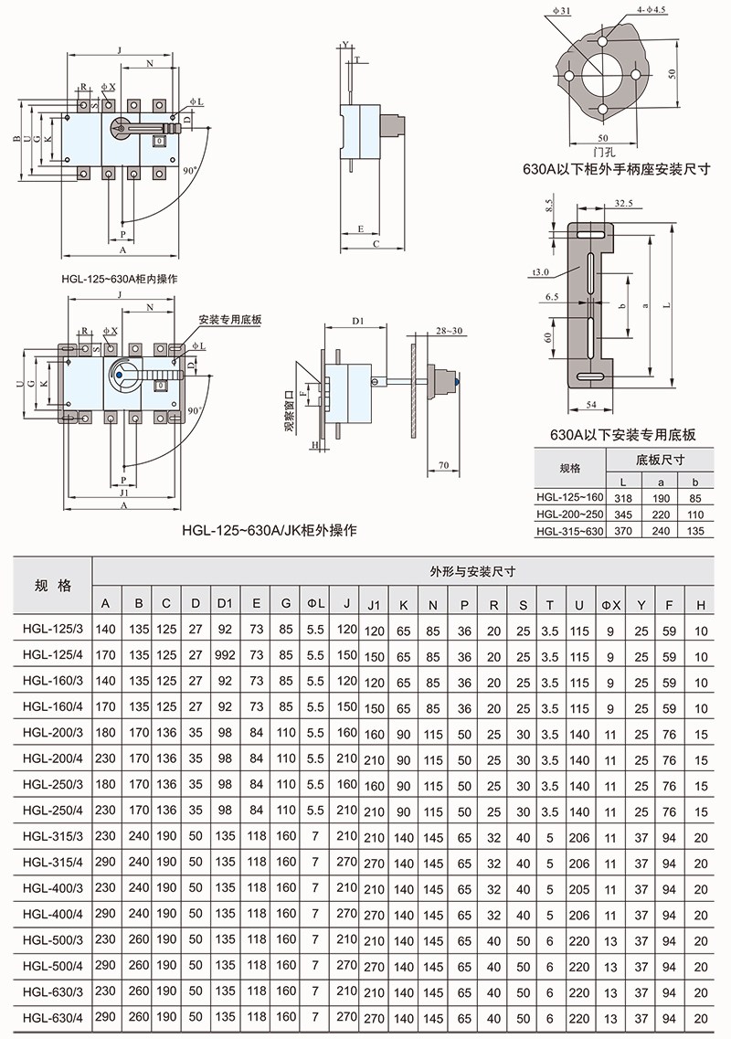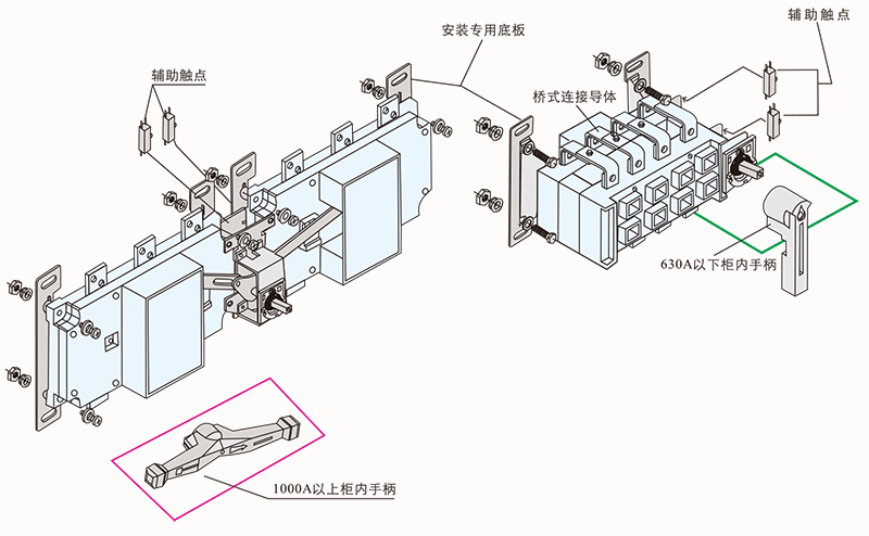 HGLZ-125~1600A适用于两条低压电路切换或者两个负载设备的转换或安全隔离等。柜内操作:手柄直接安装在开关上。柜外操作:手柄安装在配电柜柜门外。