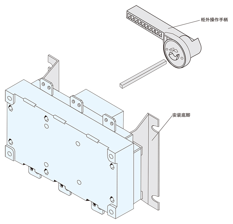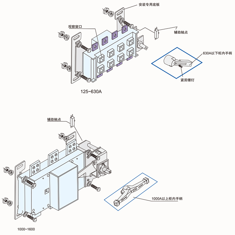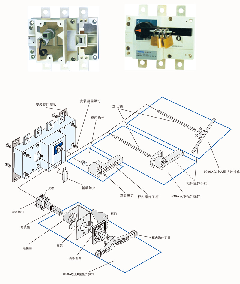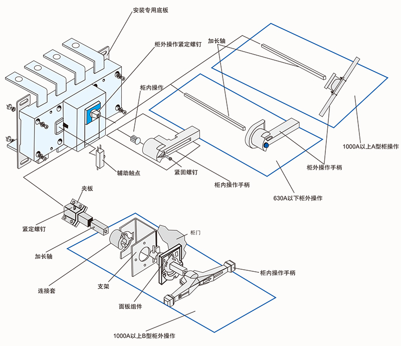 柜内操作;手柄直接安装在开关右侧。柜外操作:手柄安装在配电柜柜门外。根据需要可配装两组辅助触点。加长轴用于柜外操作。