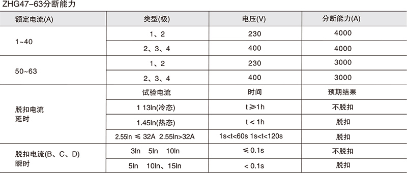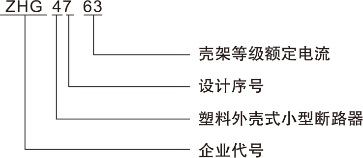 ZHG47-63系列小型断路器用于保护线路的短路和过载,适用于照明配电系统。外型小巧重量轻、性能可靠,分断能力高,脱扣迅速,标准导轨安装,壳体和部件采用阻燃及耐冲击塑料,使用寿命长,主要用于交流50/60Hz,单相230V, 三相400V线 路中的过载短路保护,同时也可以在正常情况下工作不频繁地通断电路装置和照明线路。 二、型号含义