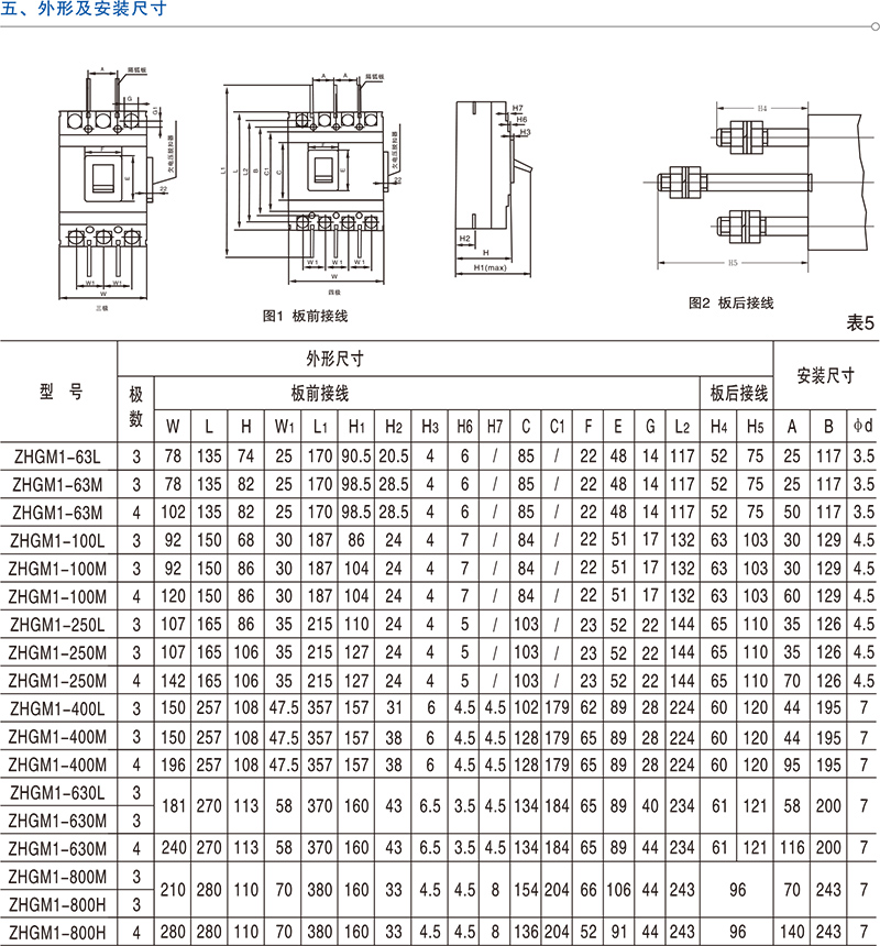 三、规格 分ZHGM1-63为(6)、10、16、20、25、32、40、50、63A九级; ZHGM1-100为(10)、16、20、25、32、40、50、63、80、100A+级; ZHGM1-250为100、125、140、160、 180、200、225、250A八级; ZHGM1-400为225、250、315、350、400A五级; ZHGM1-630为400、 500、630A三 级;