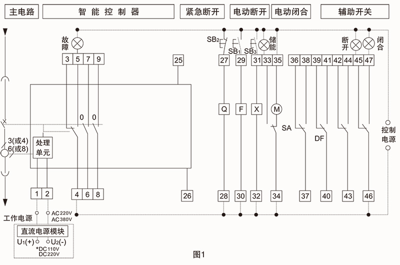 二次接线如图所示[直流电源DC110V或220V从U1(+)、U2()输入,