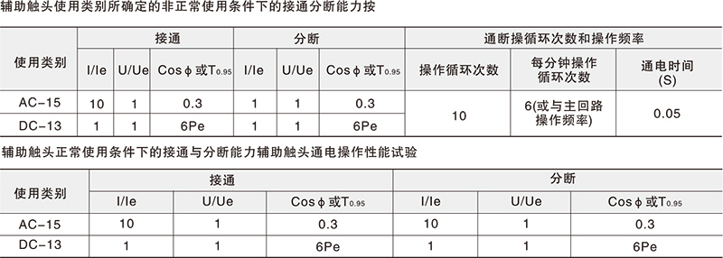 ③每分钟操作循环次数为6次或主电路相同,触头接通时间最小为0.05s或主电路接通时间相同;④辅助触头的通电操作性能为6000次。