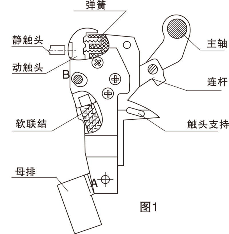 每相触头系统被安装在由绝缘体构成的小室内,其上方是灭弧室。触头系统用连杆与绝缘体外的主轴连接,从而完成闭合、断开的动作。而每相触头系统为降低电动斥力采用并联形式,触头安装在一个触头支持上。触头的一端用软联结与母排连接。断路將闭合时,主轴带动连杆使触头支持绕“A”点逆时针转动。当动触头与静触头接触后压缩弹簧从而产生足够的触头压力,确定断路器可靠接通。