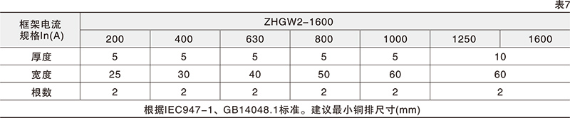 检查连接铜排尺寸,ZHGW2-1 600万能式断路器外连接铜排尺寸,根数参考表7